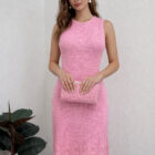 • Elegant sleeveless midi dress crafted in a textured knit fabric with a flattering fitted silhouette.