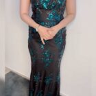 - Make an unforgettable entrance in this elegant evening gown featuring rich emerald sequins on a classic black base.