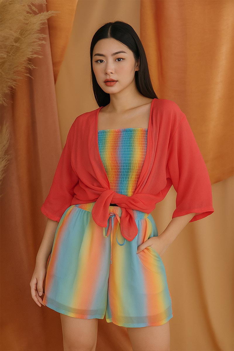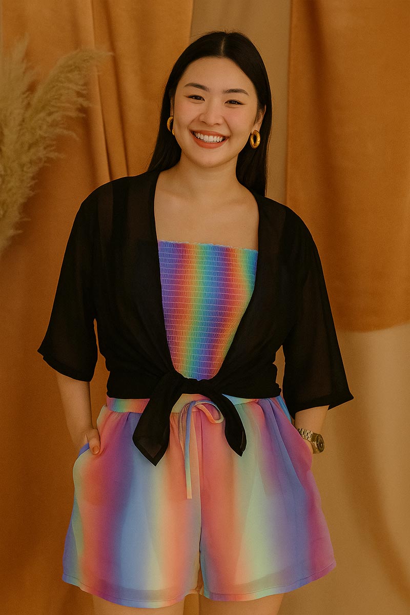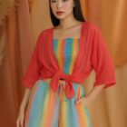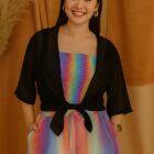 - The dress blends elegance with playfulness, combining bold structure on top with soft, dreamy multicolored hues below for a modern, eye-catching look.