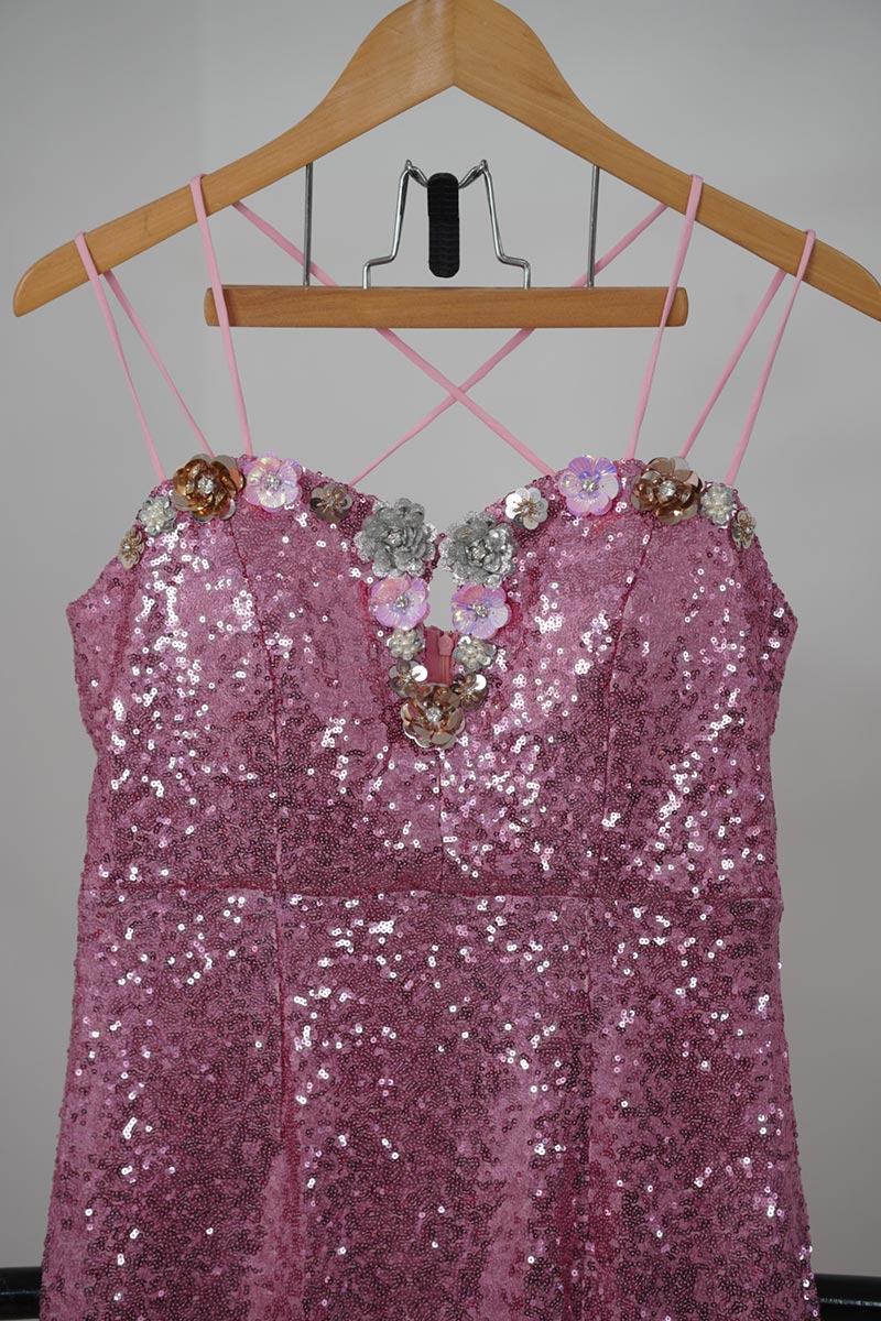 - Floral Embellished Sweetheart Neckline Accented with delicate floral appliqués that add a soft, feminine charm to the sparkling silhouette.